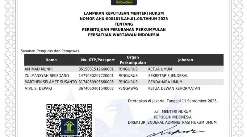 JAKARTA, gardapapua.com — Organisasi Persatuan Wartawan Indonesia (PWI) resmi kembali terdaftar di Kementerian Hukum (Kemenkum) RI dengan Nomor AHU-0001616.AH.01.08. Tahun 2025.