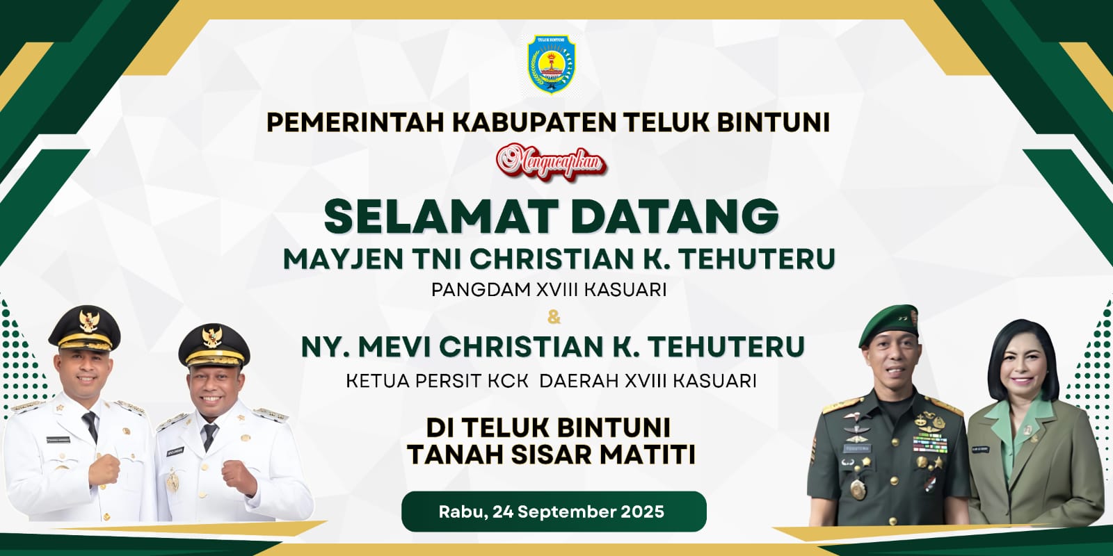 TELUK BINTUNI, gardapapua.com — Pemerintah Kabupaten Teluk Bintuni, menggelar acara ramah tamah dalam rangka menyambut kedatangan Panglima Komando Daerah Militer (Pangdam) XVIII/Kasuari, Mayor Jenderal (Mayjend) TNI Christian Kurnianto Tehuteru, beserta Ketua Persit Kartika Chandra Kirana Daerah XVIII/Kasuari, Ny. Mevi Christian Tehuteru.