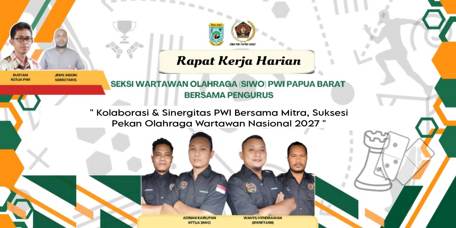 Dalam menatap Porwanas edisi kelima belas (XV) tahun 2027 mendatang, Ketua SIWO PWI Papua Barat, Adrian Kairupan, menyebut ajang tatap muka rapat harian ini, menjadi sarana SIWO PWI Papua Barat menerima masukan dan saran dari para anggota dan perwakilan atlet cabang olahraga (cabor) agar bersama merumuskan agenda menjaring atlet pada PWI daerah ditingkat kabupaten, serta memproyeksikan Cabang Olahraga (Cabor) unggulan mana saja yang siap dibidik untuk di ikuti pada Pekan Olahraga Wartawan Nasional (Porwanas) ke XV tahun 2027.