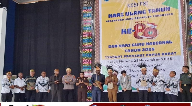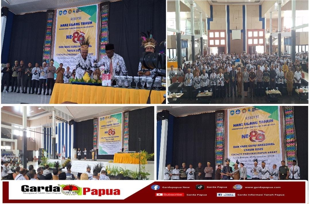 TELUK BINTUNI, gardapapua.com — Dalam suasana penuh sukacita, kegembiraan dan kebersamaan, Persatuan Guru Republik Indonesia (PGRI) Daerah Teluk Bintuni menggelar resepsi Hari Ulang Tahun PGRI ke-80, sekaligus Hari Guru Nasional Tingkat Provinsi Papua Barat, yang dilaksanakan di Kabupaten Teluk Bintuni.