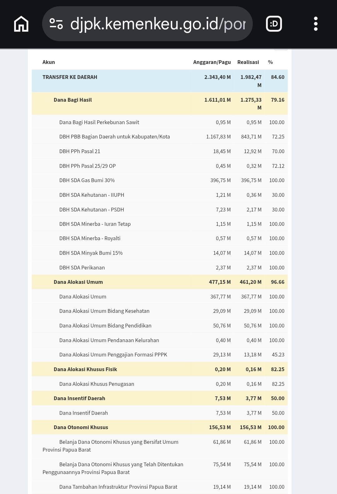 Realisasi penyaluran Dana Otsus periode 2025 melalui rekening kas umum daerah (RKUD) Pemprov Papua Barat kurang lebih sebanyak Rp. 687,006 miliar. Untuk Pemkab Teluk Bintuni telah tersalurkan tuntas seratus persen Rp. 156,532 miliar.